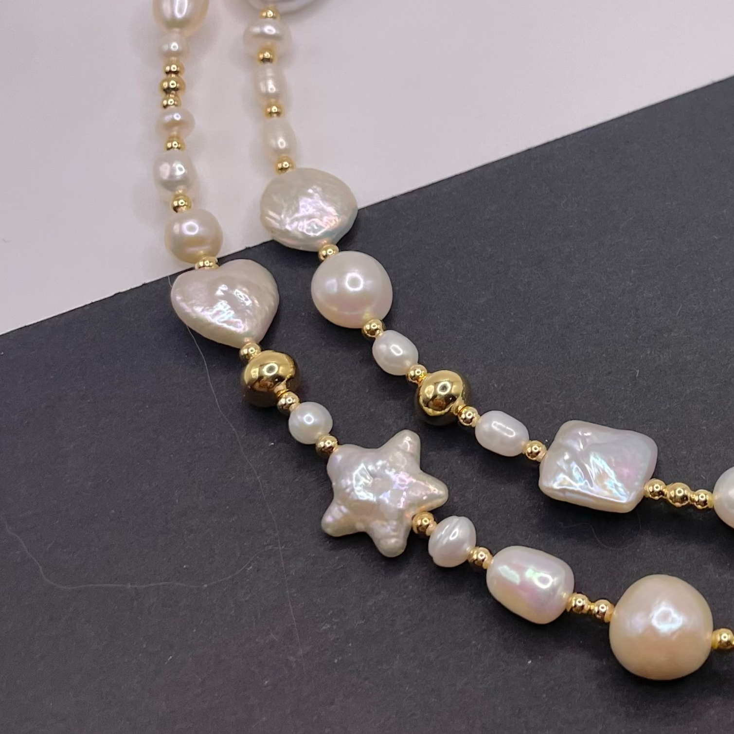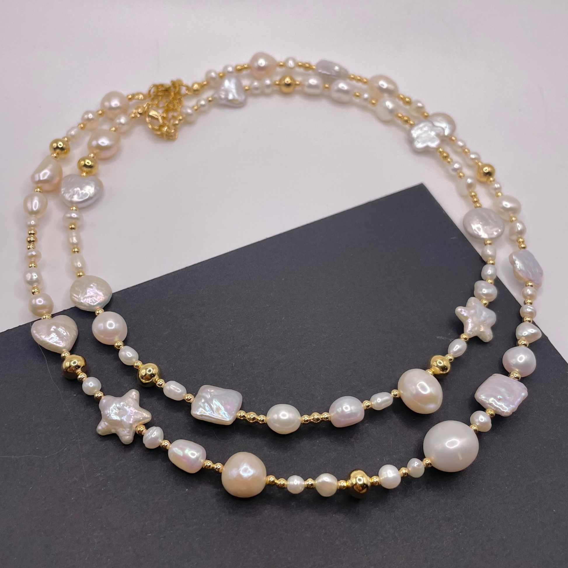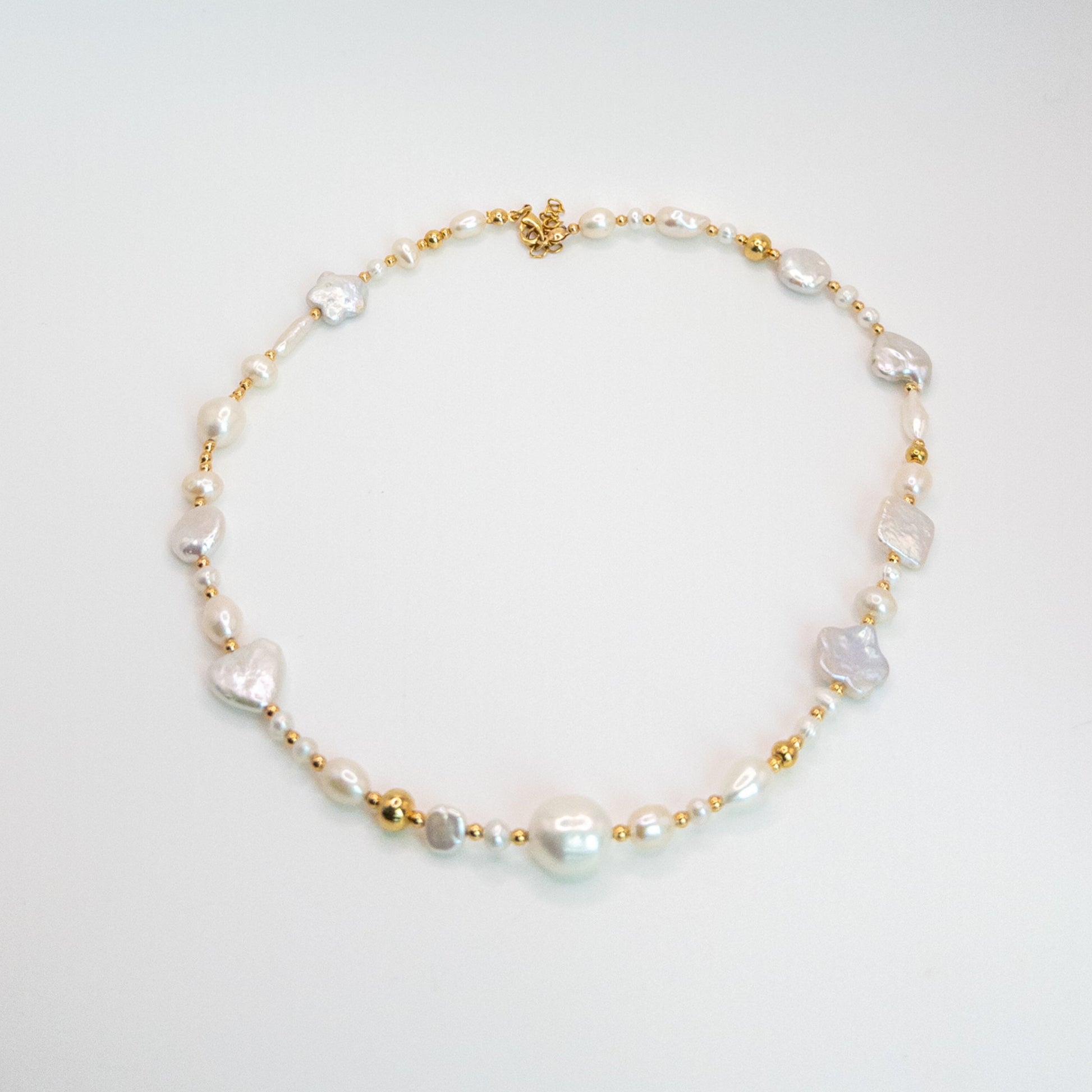 The pearl mix Necklace is made with a playful combination of freshwater pearls in different shapes — stars, hearts, rounds, and squares. Each one is slightly different, making every necklace truly one of a kind.